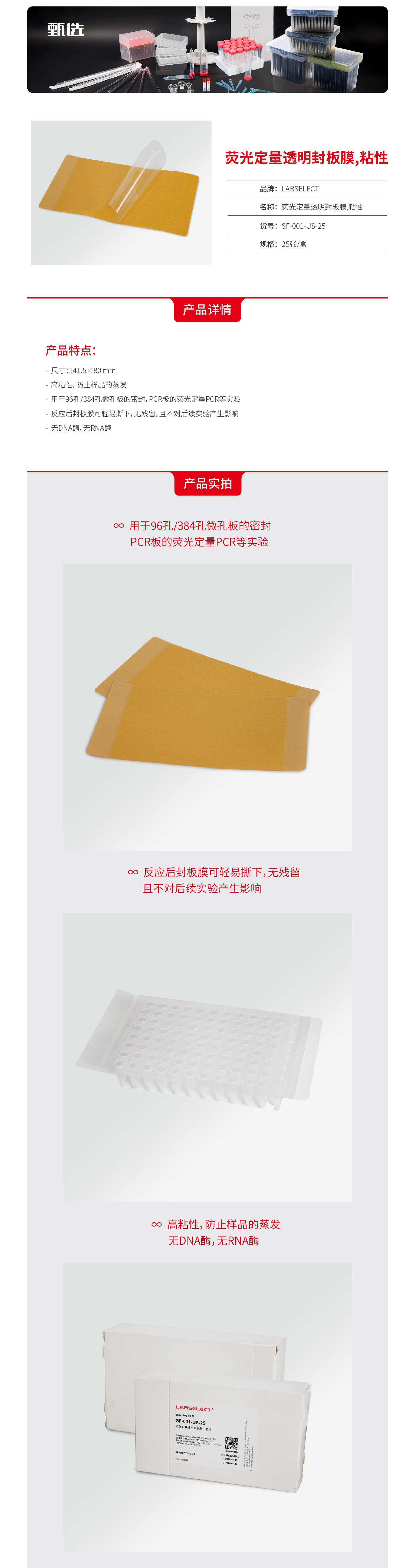 LABSELECT(甄选)SF-001-US-25 荧光定量透明封板膜,粘性