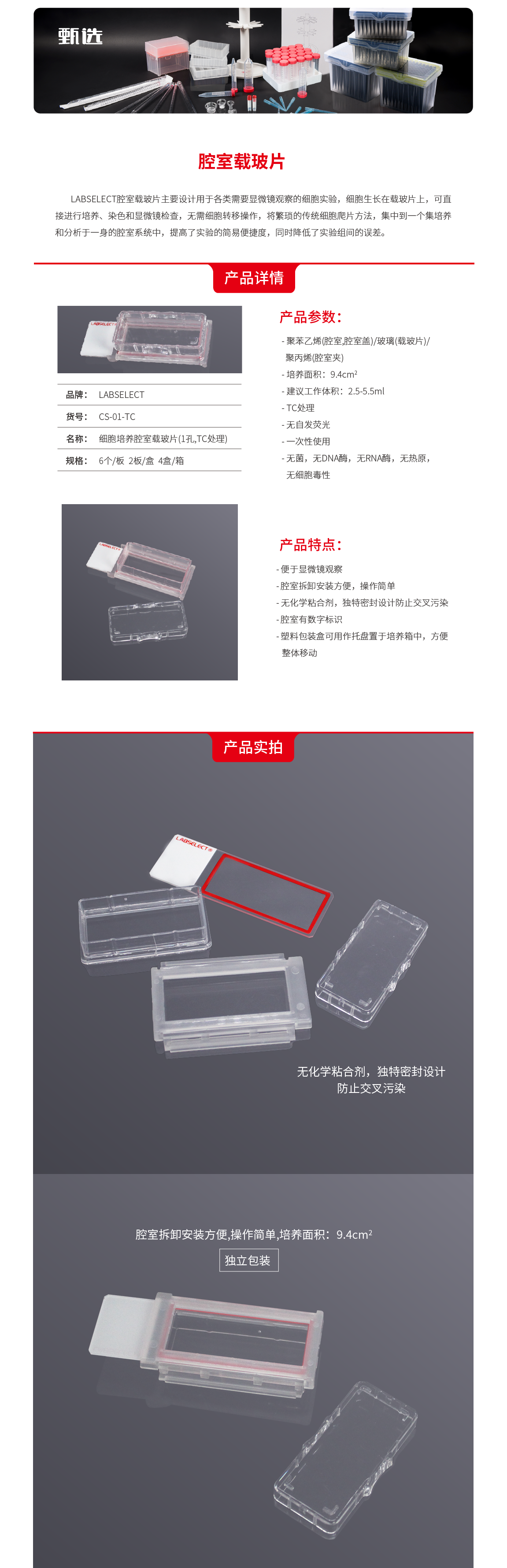 LABSELECT(甄选)CS-01-TC 细胞培养腔室载玻片(1孔,TC处理)