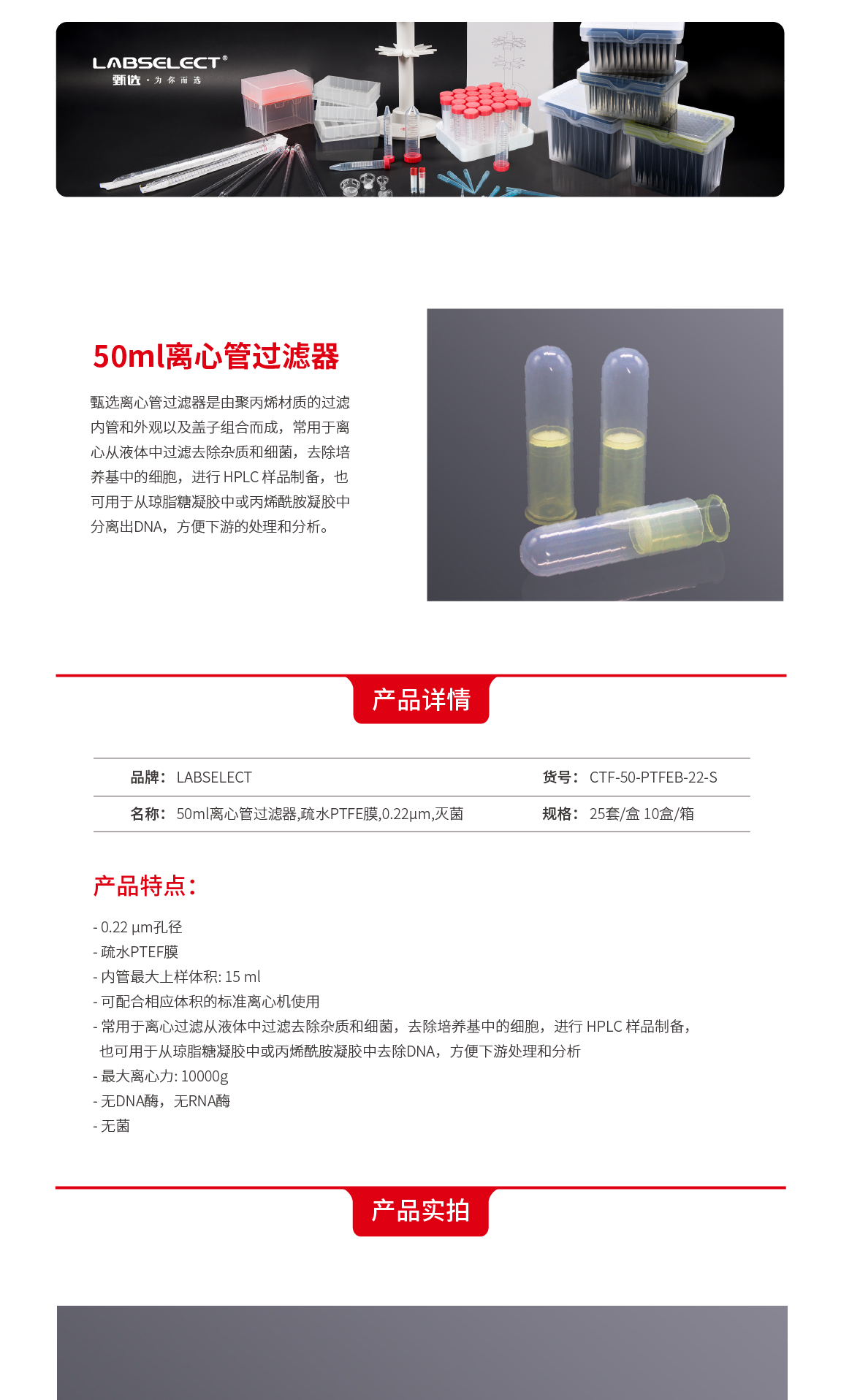 LABSELECT(甄选)CTF-50-PTFEB-22-S 50ml离心管过滤器,疏水PTFE膜,0.22μm,灭菌