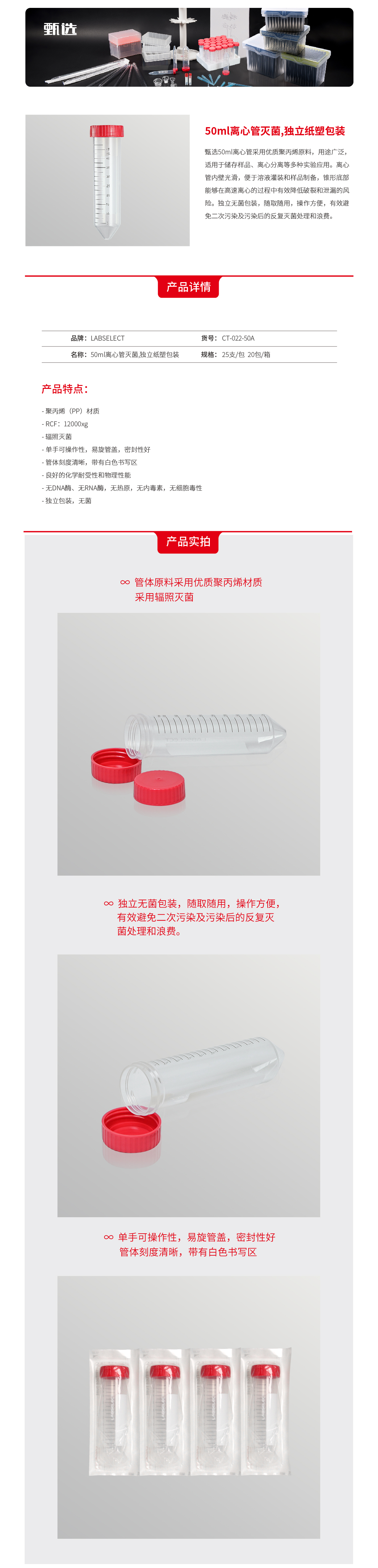 LABSELECT(甄选)CT-022-50A 50ml离心管灭菌,独立纸塑包装