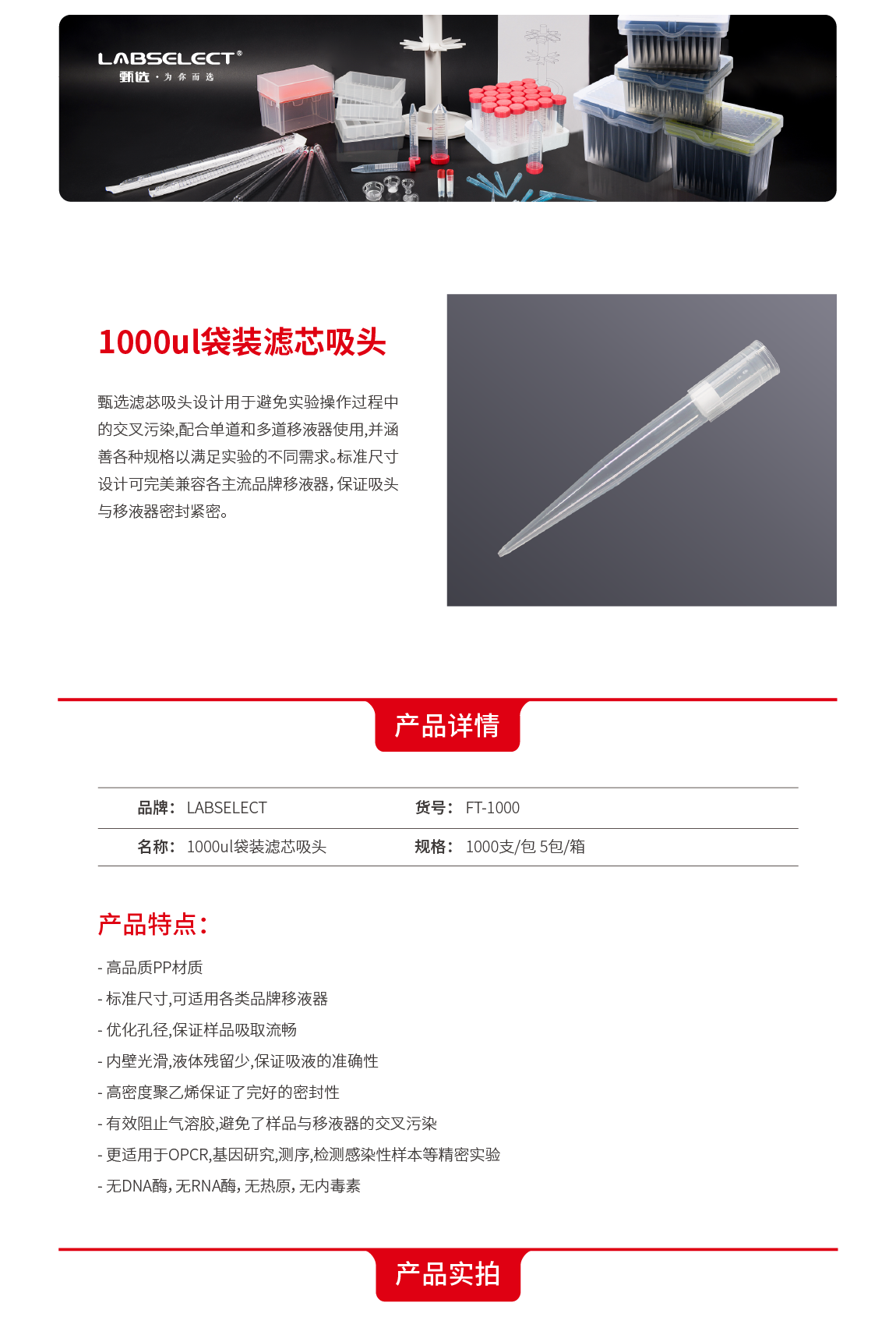 LABSELECT(甄选)FT-1000 1000ul袋装滤芯吸头77.98mm