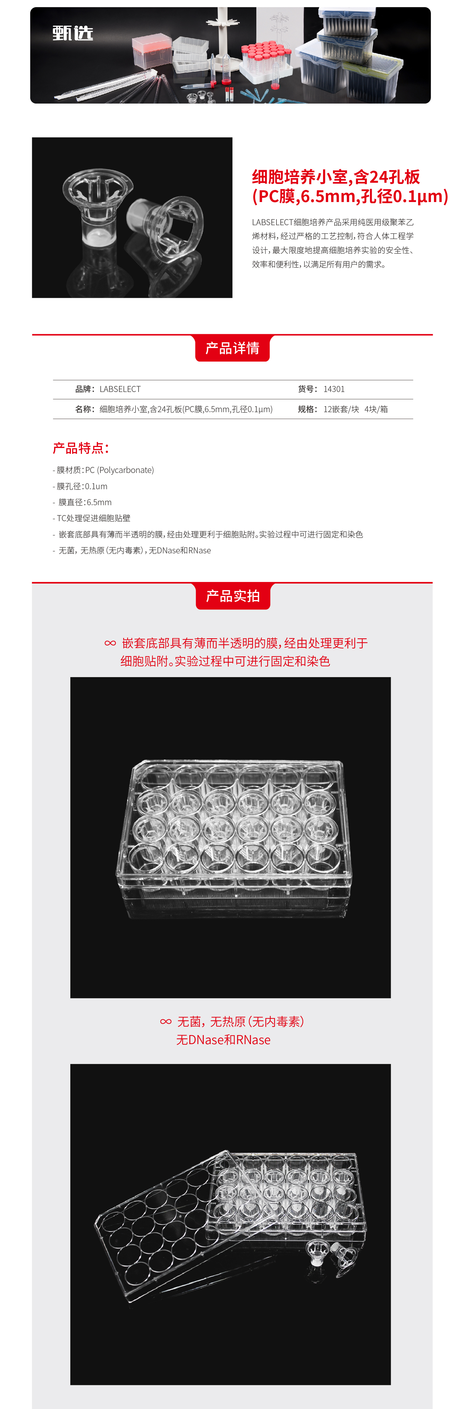 LABSELECT(甄选)14301 细胞培养小室,含24孔板(PC膜,6.5mm,孔径0.1μm)